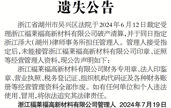 浙江省湖州市吴兴区法院于2024年6月12日裁定受理浙江福莱福高新材料有限公司破产清算,并于同日指定浙江泽大(湖州)律师事务所担任管理人。管理人接受指定后,未能接管浙江福莱福高新材料有限公司印章、证照等经营管理人资料,现公告声明如下: