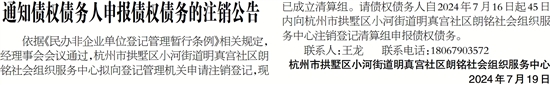 依据《民办非企业单位登记管理暂行条例》相关规定,经理事会会议通过,杭州市拱墅区小河街道明真宫社区朗铭社会组织服务中心拟向登记管理机关申请注销登记,现已成立清算组。请债权债务人自2024年7月16日起45日内向杭州市拱墅区小河街道明真宫社区朗铭社会组织服务中心注销登记清算组申报债权债务。