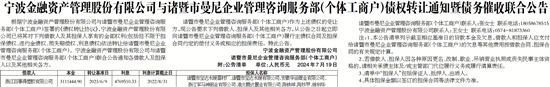 根据宁波金融资产管理股份有限公司与诸暨市曼尼企业管理咨询服务部(个体工商户)签署的《债权转让协议》,宁波金融资产管理股份有限公司已将其对下列借款人及其担保人享有的全部权利(包括但不限于担保债权、违约金债权、损失赔偿权、利息债权)依法转让给诸暨市曼尼企业管理咨询服务部(个体工商户)。宁波金融资产管理股份有限公司与诸暨市曼尼企业管理咨询服务部(个体工商户)联合公告通知各借款人及担保人以及其他相关各方。