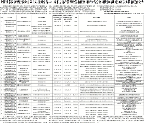 根据上海浦东发展银行股份有限公司杭州分行与中国东方资产管理股份有限公司浙江省分公司签署的《上海浦东发展银行不良资产转让协议》(签订日期:2024年6月20日),上海浦东发展银行股份有限公司杭州分行已将其对下列借款人及其担保人项下享有的全部权利(包括但不限于主债权、担保债权、违约金债权、利息债权、损失赔偿权)依法转让给中国东方资产管理股份有限公司浙江省分公司。上海浦东发展银行股份有限公司杭州分行与中国东方资产管理股份有限公司浙江省分公司联合公告通知各借款人及担保人以及其他相关各方。