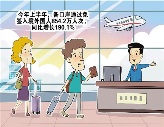 | 近段时间,随着中国免签“朋友圈”不断扩容、国际航班持续恢复,商务洽谈、来华旅游等活动加速复苏。最新数据显示,今年上半年,全国移民管理机构共查验出入境人员2.87亿人次,同比增长70.9%,其中各口岸通过免签入境外国人854.2万人次,同比增长190.1%。 新华社 朱慧卿 作 |