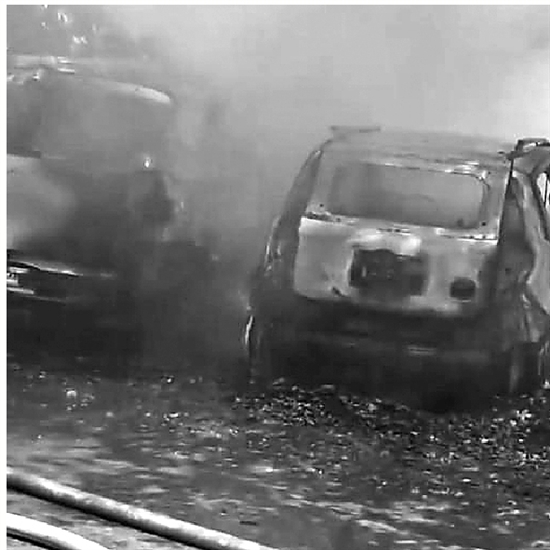 近日,江西九江,一辆停靠在路边的电动汽车突发自燃。消防员接警后赶赴现场,远远望去黑烟冲天,周围树林茂密,火势蔓延迅速,救援人员立即架设水枪将火扑灭,汽车已经烧得只剩钢架。