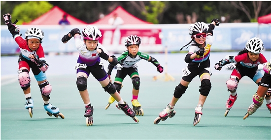 图为7月28日,小朋友们在河南省洛阳市洛龙区张衡街一体育公园内参加速度轮滑友谊赛。