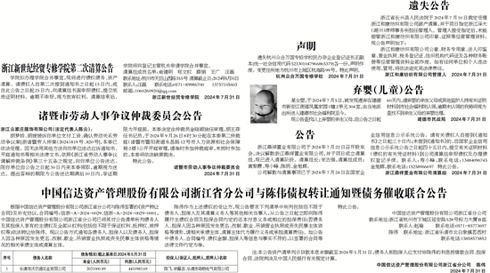 根据中国信达资产管理股份有限公司浙江省分公司与陈伟签署的《资产转让合同》及补充协议,合同编号:信浙-A-2024-0029、信浙-A-2024-0029-0001,中国信达资产管理股份有限公司浙江省分公司已将其对公告清单所列债务人及其担保人享有的主债权及全部从权利(包括但不限于保证权利、抵押权、质押权等)依法转让给陈伟。现以公告方式通知各债务人、担保人以及债务人、担保人因各种原因发生更名、改制、歇业、吊销营业执照或丧失民事主体资格等情况的相关承债主体或清算主体。