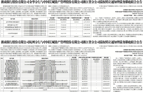 根据浙商银行股份有限公司金华分行与中国长城资产管理股份有限公司浙江省分公司签署的《债权转让协议》(中长资(浙)合字【2024】213号),浙商银行股份有限公司金华分行已将其对下列借款人及其担保人项下享有的全部权利(包括但不限于主债权、担保债权、违约金债权、利息债权、损失赔偿权)依法转让给中国长城资产管理股份有限公司浙江省分公司。浙商银行股份有限公司金华分行与中国长城资产管理股份有限公司浙江省分公司联合公告通知各借款人及担保人以及其他相关各方。