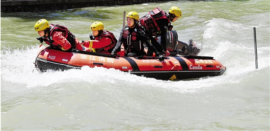 8月1日上午9时许,杭州消防特勤一站附近的河道里,一组消防员驾驶舟艇进行舟艇过障碍、离心力救援等水域项目救援训练。 本报记者 陈立波 通讯员 赵翔 摄