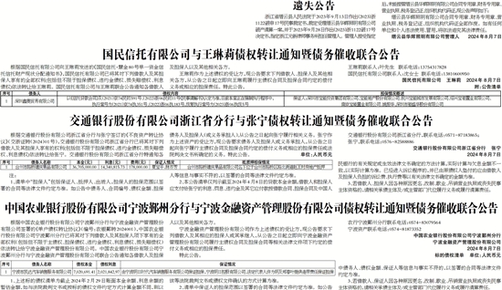 根据交通银行股份有限公司浙江省分行与张宁签订的《不良资产转让协议》(交浙证转(2024)01号),交通银行股份有限公司浙江省分行已将其对下列借款人及其担保人享有的权利(包括但不限于担保债权、违约金债权、损失赔偿权、利息债权)依法转让给张宁。交通银行股份有限公司浙江省分行特通知各债务人及担保人(或义务承担人),从公告之日起向张宁履行相关义务。张宁作为上述资产的受让方,现公告要求债务人及担保人或义务承担人,从公告之日起向张宁履行主债权合同及担保合同约定的偿付义务或相应的担保责任或法院判决文书所确定的义务。特此公告。 单位:人民币元