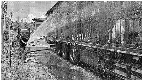 本报讯 近日,在G25长深高速丽水北出口一辆满载生猪的货车上,100多头“二师兄”中暑,急需降温。焦急之下,司机求助当地消防。