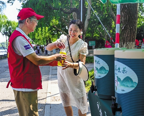 8月6日,在杭州西湖景区“西子驿·柳浪闻莺”免费凉茶供应点,72岁的志愿者施志平给来往的游客递上免费凉茶。这是他连续第13年参加这项志愿服务。杭州连日高温,在西湖景区沿湖13个凉茶点位,志愿者们依然坚守岗位,为市民和游客、一线工作者送去清凉。 董旭明 摄