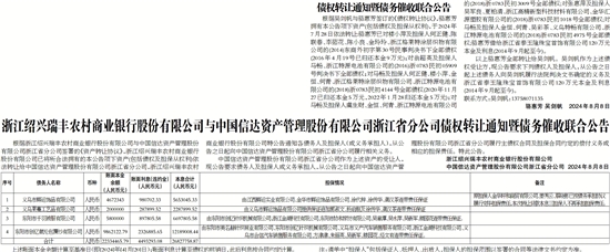 根据浙江绍兴瑞丰农村商业银行股份有限公司与中国信达资产管理股份有限公司浙江省分公司签署的《资产转让协议》,浙江绍兴瑞丰农村商业银行股份有限公司已将所合法拥有的本公告项下资产(包括债权及担保从权利)依法转让给中国信达资产管理股份有限公司浙江省分公司,浙江绍兴瑞丰农村商业银行股份有限公司特公告通知各债务人及担保人(或义务承担人),从公告之日起向中国信达资产管理股份有限公司浙江省分公司履行相关义务。