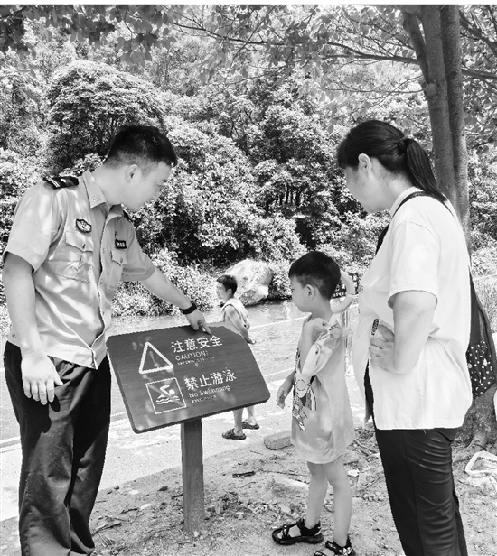 连日来,温州市公安局龙湾区分局瑶溪派出所民警来到辖区内水库塘河等重点水域“巡河”,阻止市民“野泳”的同时,向市民面对面讲解防溺水知识,提醒市民牢记“安全第一”。