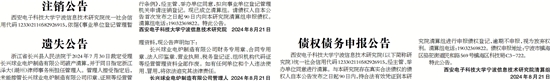 西安电子科技大学宁波信息技术研究院统一社会信用代码123302110582926915,依据《事业单位登记管理暂行条例》,经主管、举办单位同意,拟向事业单位登记管理机关申请注销登记。现已成立清算组。请债权人自本公告首次发布之日起90日内向本研究院清算组申报债权。清算组电话:19032369822。特此公告。