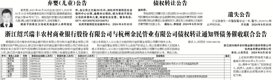 根据浙江绍兴瑞丰农村商业银行股份有限公司与杭州金民管业有限公司签署的《资产转让协议》,浙江绍兴瑞丰农村商业银行股份有限公司已将所合法拥有的本公告项下资产(包括债权及担保从权利)依法转让给杭州金民管业有限公司,浙江绍兴瑞丰农村商业银行股份有限公司特公告通知各债务人及担保人(或义务承担人),从公告之日起向杭州金民管业有限公司履行相关义务。
