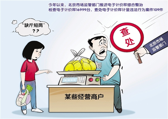 | 北京市市场监管局近日发布消息称,今年以来,北京市场监管部门推进电子计价秤综合整治,全方位打击“缺斤短两”违法行为,共检查集贸市场、商场超市、其他经营商户等2743家,检查电子计价秤16999台,查处电子计价秤计量违法行为案件109件。 新华社 曹一 |