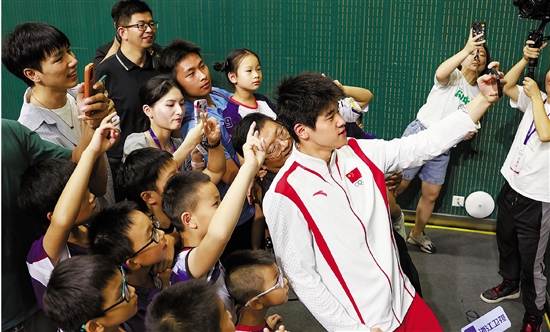 | 9月3日,潘展乐、黄雨婷、徐嘉余、黄雅琼、郑思维、季博文、叶诗文7位奥运健儿来到杭州黄龙体育中心参加“体育力量 青春榜样”主题活动,传递体育力量、激发青春热情、弘扬社会正气。图为游泳运动员潘展乐与参加活动的小朋友们合影。 新华社 江汉 摄 |