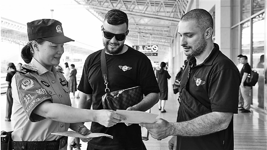 近日,杭州铁路公安处台州火车站派出所民警用双语向外籍旅客宣传铁路安全知识和乘车注意事项,提升旅客的出行安全意识。