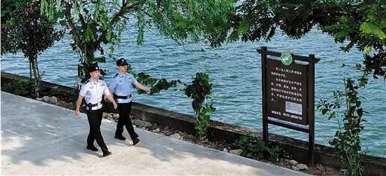 “活化石”瓯江鼋被誉为“水中大熊猫”,是国家一级保护动物,在青田形成种群规模。近年来,青田县公安局全力打造“生态共护”警务协作新格局,构筑瓯江流域“大保护”生态屏障,为护航绿色发展擦亮平安底色。图为船寮派出所民警在鼋保护区开展巡逻。