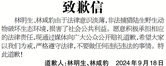 林明生、林咸豹由于法律意识淡薄,非法捕猎陆生野生动物破坏生态环境,损害了社会公共利益。愿意积极承担相应的法律责任,现通过媒体向广大公众公开赔礼道歉,希望大家以我们为戒,严格遵守法律,不要做任何违纪违法的事情。特此道歉!