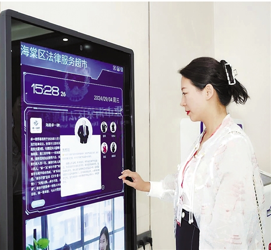 据了解,海棠区法律服务超市通过衔接指引、集中进驻的创新方式,引进了18家专业法律服务机构和10家相关单位,汇集法律咨询、诉讼代理、人民调解、公证、仲裁、鉴定等多项法律业务,实现集约高效、互动交融,为群众和企业提供“一站式”、全方位的法律服务。