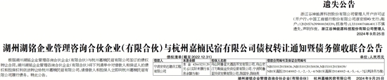 湖州湖铭企业管理咨询合伙企业(有限合伙)与杭州嘉楠民宿有限公司债权转让通知暨债务催收联合公告