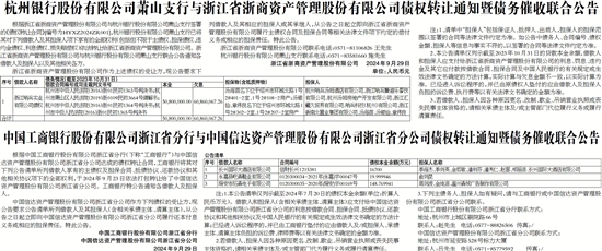 中国工商银行股份有限公司浙江省分行与中国信达资产管理股份有限公司浙江省分公司债权转让通知暨债务催收联合公告