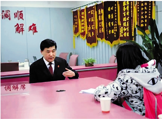 桌子上方,“调和、调顺、解忧、解难”的标语醒目。朱学军坐在“T型”桌的正中间,他倾听、劝解、谨慎地表达每一次态度,不偏激、不偏袒。很多时候,调解双方最终都会获得一个满意的结果,握手言和。
