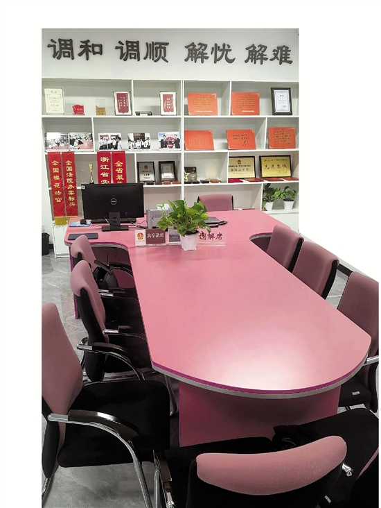 2021年,随着杭州市行政区划的调整,江干区被撤销,但“朱学军法官调解工作室”这张金字招牌保留了下来,并于今年搬入位于杭州市紫花支路6号的上城区人民法院院内,粉色“T型”长桌也一并搬入工作室的新场地。