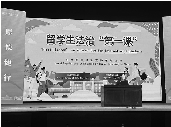 本报讯 近日,杭州西湖区司法局、留下司法所联合浙江工业大学,为2024级来华留学生召开迎新典礼暨入学法治教育大会。来自全球80多个国家的640余名留学生参加。