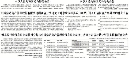 中国信达资产管理股份有限公司浙江省分公司关于对永康市居美乐日用品厂等7户债权资产包处置的补充公告