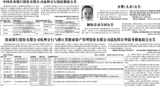 根据招商银行股份有限公司杭州分行与浙江省浙商资产管理股份有限公司达成的债权转让安排,招商银行股份有限公司杭州分行(含各分支行)将其对公告清单所列借款人及其担保人享有的主债权及借款合同、担保合同、抵债协议、还款协议和其他相关协议项下的全部权利,依法转让给浙江省浙商资产管理股份有限公司。招商银行股份有限公司杭州分行及浙江省浙商资产管理股份有限公司特公告通知各借款人、担保人以及借款人、担保人因各种原因发生更名、改制、歇业、吊销营业执照或丧失民事主体资格等情况的相关承债主体或清算主体。浙江省浙商资产管理股份有限公司作为上述债权的受让方,现公告要求公告清单中所列包括但不限于债务人、担保人及其清算业务人等其他相关当事人,从公告之日起立即向浙江省浙商资产管理股份有限公司履行主债权合同及担保合同约定的还本付息义务或相应的担保责任(若借款人、担保人因各种原因发生更名、改制、歇业、吊销营业执照或丧失民事主体资格等情形,请相关承债主体、清算主体代为履行义务或承担清算责任)。特此公告。