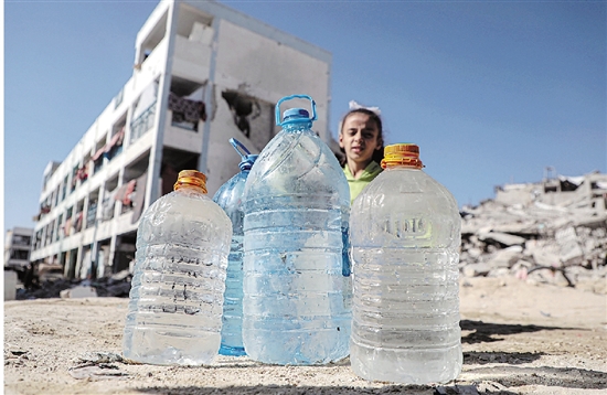 图为10月20日,一名女孩在加沙地带南部城市汗尤尼斯取水。