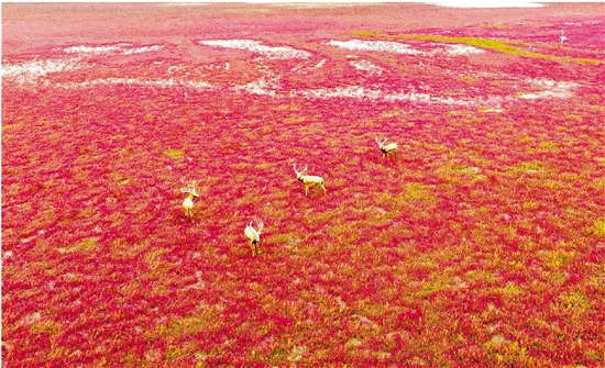 图为10月16日,江苏东台条子泥湿地,麋鹿在盐蒿地栖息(无人机照片)。 新华社 孙家录 摄