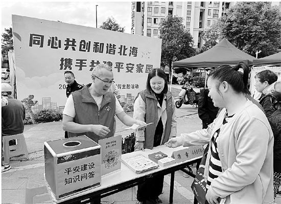 近日,绍兴市越城区北海街道联合北海司法所、信达社区,在冠城广场举办平安宣传活动。志愿者服务队为居民提供理发、磨刀、测血压等服务;工作人员提醒居民提防诈骗,保护个人信息等,共同营造和谐家园。