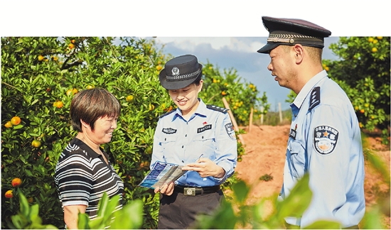 | “藏蓝”护秋收 武义县公安局紧扣辖区农业生产特点,探索创新“共富警务”机制,依托“四季守护”模式,聚焦群众所需所盼,将警力下沉至田间地头,开展治安巡逻、反诈宣传、矛盾调解、打击犯罪等工作,全力守护乡村好“丰”景。图为近日民警走进果园,向果农宣讲反诈知识。 通讯员 王国仙 摄 |