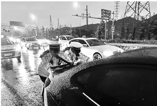 | 交警冒雨推车,帅! 近日,天雨,在台州市椒江区前所街道某路段,一辆轿车抛锚在路上,引发了交通拥堵。正在附近执勤的台州市公安局交通警察局直属一大队前所中队2名交警发现后,冒雨将抛锚车辆推至不影响其他车辆通行的安全地带,快速恢复通行秩序。 通讯员 叶亚枚 何文斌 摄 |