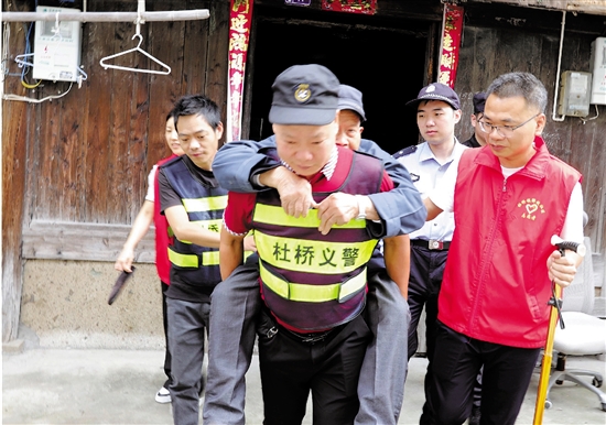 近日,临海市杜桥镇组织公安、社区、义警、行政执法等部门工作人员开展抗台风人员疏散演练。图为演练中,义警队员等人背起腿脚不便的老人安全转移。