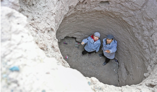 | 考古专家覃大海(右)和新疆古道研究专家骆娟查看一处古代居住遗址 |