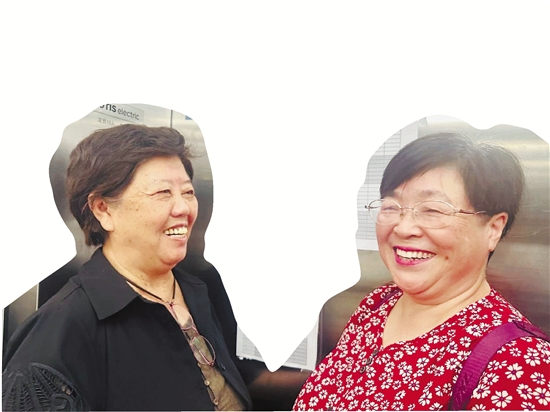 黄幼兰(穿黑色衣服)和王凤兰带记者体验美政桥社区的第一台加装电梯