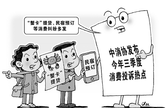 | “蟹卡”提货、民宿预订等消费纠纷多发……中消协近日公布的今年第三季度全国消协组织受理投诉情况分析显示,生活及社会服务类在服务大类投诉中居首位。在具体服务投诉中,投诉量居前五的分别为经营性互联网服务、移动电话服务、餐饮服务、培训服务、住宿服务。 新华社 徐骏 作 |