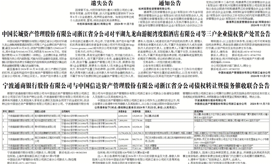 中国信达资产管理股份有限公司浙江省分公司作为上述债权的受让方,现公告要求公告清单中所列借款人及其担保人,从公告之日起立即向中国信达资产管理股份有限公司浙江省分公司履行主债权合同及担保合同约定的还本付息义务或相应的担保责任,并积极配合办理变更登记等相关事宜。特此公告。
