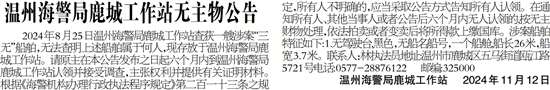 2024年8月25日温州海警局鹿城工作站查获一艘涉案“三无”船舶,无法查明上述船舶属于何人,现存放于温州海警局鹿城工作站。请原主在本公告发布之日起六个月内到温州海警局鹿城工作站认领并接受调查,主张权利并提供有关证明材料。根据《海警机构办理行政执法程序规定》第二百一十三条之规定,所有人不明确的,应当采取公告方式告知所有人认领。在通知所有人、其他当事人或者公告后六个月内无人认领的,按无主财物处理,依法拍卖或者变卖后将所得款上缴国库。涉案船舶特征如下:1.无驾驶台,黑色,无船名船号,一个船舱,船长26米,船宽3.7米。联系人:林执法员地址:温州市鹿城区五马街道瓯江路5721号电话:0577-28876122 邮编:325000