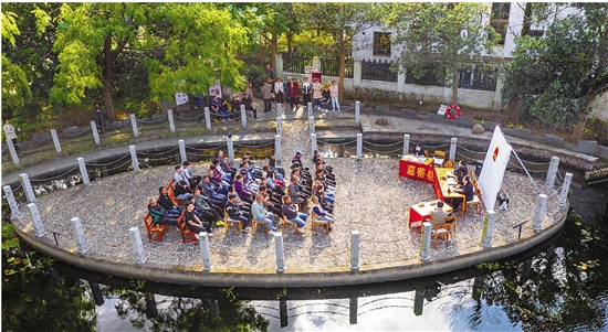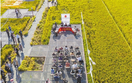 秋天的“第一次”巡回庭审在全国民主法治示范村西塘镇荷池村的“水上舞台”拉开帷幕。随着审判长的法槌落下,全场立刻鸦雀无声。案件陈述、质证举证、法庭辩论……每一个环节,村民们都仔细聆听(图①)。在随后的互动环节,村民们积极提问,法官耐心解答,现场气氛热烈。“让老百姓在家门口就能感受到真实的开庭氛围,这种形式他们不但听得进,而且听得懂,普法效果非常好。”西塘司法所所长赵艳感慨道。