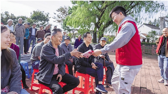 踏入农业强村新胜村,阵阵稻香之中,省级金牌调解工作室“老鲁工作室”负责人鲁明强在文化礼堂为村民讲解民法典在日常生活中的应用(图②)。而在红菱村稻米文化生活馆,浙江开发律师事务所律师周燕燕则带去一场以民法典为主题的生动法治课,为村民详细讲解这部“社会生活的百科全书”(图③)。