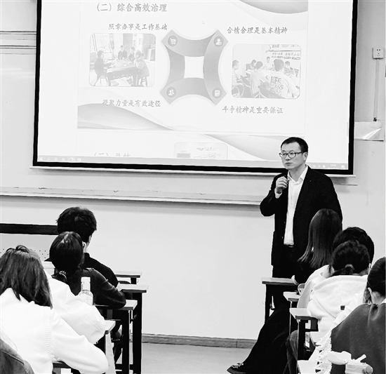 | 本报记者 徐冬梅 见习记者 孔珂依 本报讯 11月13日,华东政法大学和浙江法治报联合举办的“社会治理报告荟”迎来了第二讲——来自湖州的乡镇党委书记和社会治理中心主任,聚焦时下的基层治理工作和新时代“枫桥经验”背景下的矛盾纠纷化解办法两个主题,为70余名大学生带去了一堂别开生面的思政团课。 今年7月,由华东政法大学韬奋新闻传播学院、长三角法治与传媒研究院主办,长三角三省一市法治报等单位共同承办的“大学生·记者携手看长三角社会治理”暑期实践调研活动在浙江宁波、嘉兴、湖州等地开展。此后,华东政法大学又在韬奋学院开设“社会治理报告荟”,让基层一线工作者走上高校讲台,旨在创新丰富高校思政课内容形式,实现社会治理工作和高校教育的双向奔赴。 |