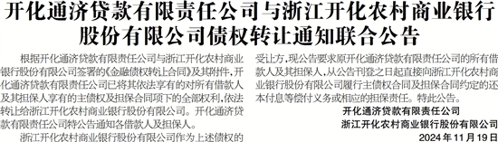 浙江开化农村商业银行股份有限公司作为上述债权的受让方,现公告要求原开化通济贷款有限责任公司的所有借款人及其担保人,从公告刊登之日起直接向浙江开化农村商业银行股份有限公司履行主债权合同及担保合同约定的还本付息等偿付义务或相应的担保责任。特此公告。