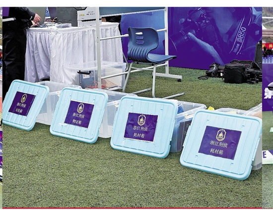 每个“隔间”里,都有一辆“被盗”轿车的现场,车边,32支参赛队都搭起了“工作台”,桌上放着照相机、电脑、打印机等一系列专业设备,边上树着一块小黑板,地上还有七八个“设备箱”。浙江代表队的场地里,还整齐排列着4个密封箱,依次是——2个耗材箱、1个物证箱、1个垃圾箱。