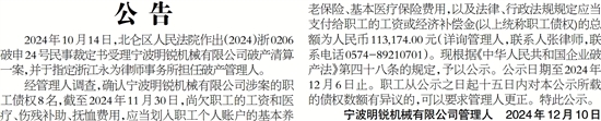 经管理人调查,确认宁波明锐机械有限公司涉案的职工债权8名,截至2024年11月30日,尚欠职工的工资和医疗、伤残补助、抚恤费用,应当划入职工个人账户的基本养老保险、基本医疗保险费用,以及法律、行政法规规定应当支付给职工的工资或经济补偿金(以上统称职工债权)的总额为人民币113,174.00元(详询管理人,联系人张律师,联系电话0574-89210701)。现根据《中华人民共和国企业破产法》第四十八条的规定,予以公示。公示日期至2024年12月6日止。职工从公示之日起十五日内对本公示所载的债权数额有异议的,可以要求管理人更正。特此公示。