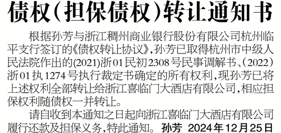 请自收到本通知之日起向浙江喜临门大酒店有限公司履行还款及担保义务,特此通知。 孙芳 2024年12月25日