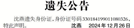 沈燕遗失身份证,身份证号码330184199011080326,特此声明。 沈燕 2024年12月26日