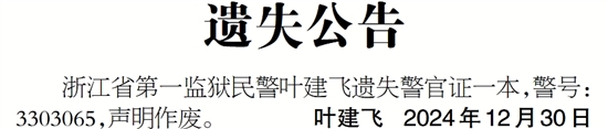 浙江省第一监狱民警叶建飞遗失警官证一本,警号: 3303065,声明作废。 叶建飞 2024年12月30日